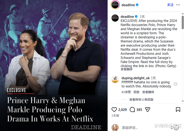 哈里梅根又一次因离谱操作被全网群嘲!此前和网飞配合的马球记载片收视绝对扑街,两东谈主非但莫得实时止损,反而官宣将再打造一部同题材的剧情类剧集,音问一出,天下网友直呼:他俩是果真少许资历王人没学到!