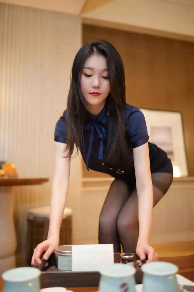 深蓝色短袖衬衫搭配同色系的紧身包臀半身裙,呈现出一种高度和解的视觉好意思感。精妙之处在于领口的谋划——立领鸠合小巧的蝴蝶结,注入了一点女性非凡的柔好意思。一条极细的腰带精确地分袂出黄金比例,搭配黑丝与玄色尖头高跟鞋,使得举座造型在专科之余流露出不能骚扰的优雅。这种搭配极其合乎高端业绩行业或进犯的商务洽谈地方。