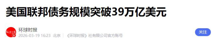 2026年3月18日,好意思国财政部公布了一个触动公共金融商场的数字,好意思债范畴达到39万亿好意思元。这个数字格外于公共GDP总量的近四成,平均每个好意思国东谈主要职守提升11万好意思元的债务。据好意思国国会预算办公室测算,到2026年秋天,好意思债范畴还会轻易40万亿好意思元。